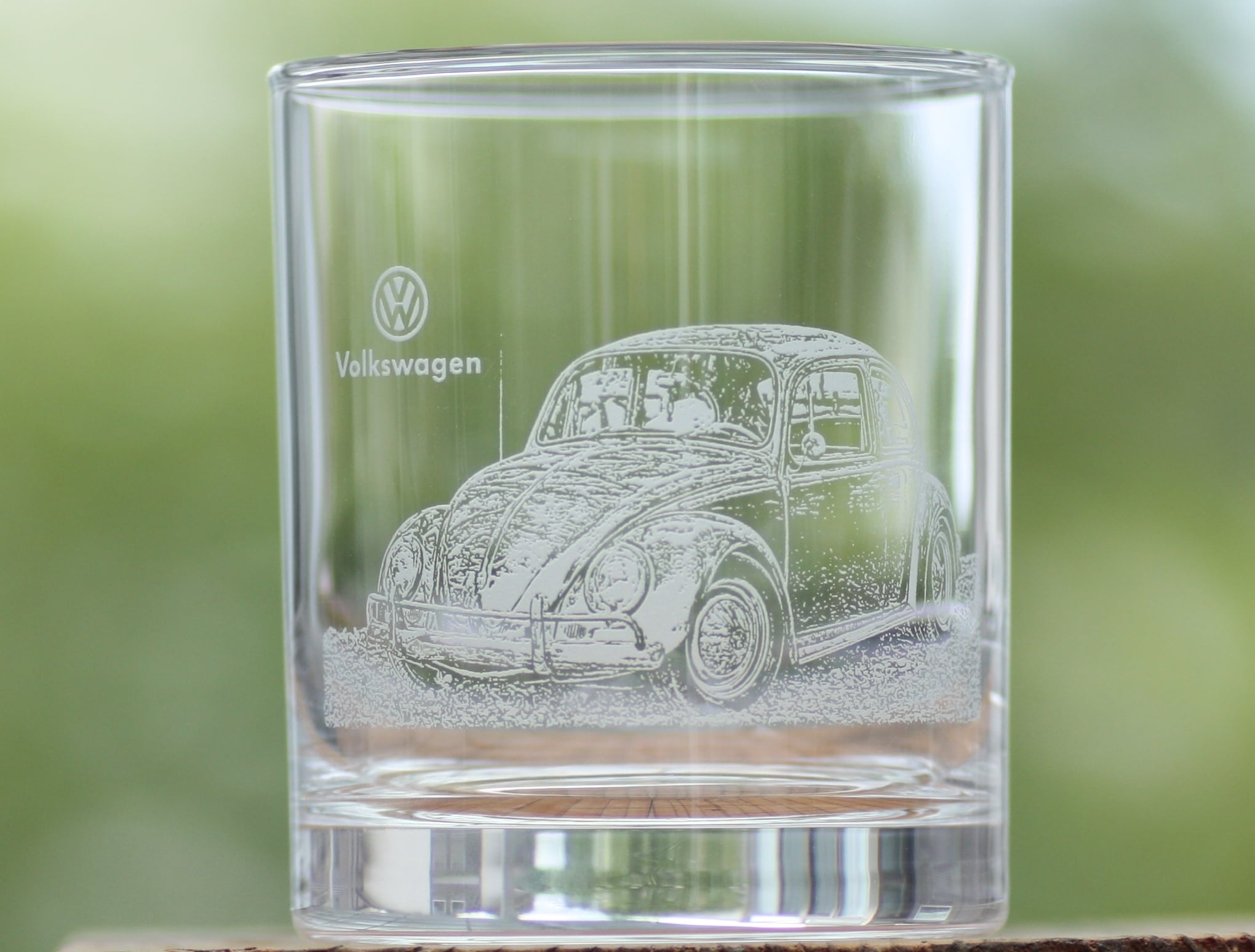 ロックグラスの表面に「フォルクスワーゲン ビートル」のイラストを彫刻しています。